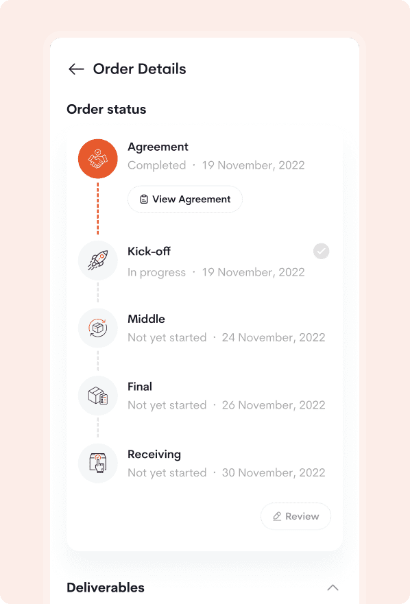 عند إتمام طلبك والدفع من خلال منصة فيدلن يتم إنشاء إتفاقية بيع تحتوي على جميع التفاصيل الخاصة بالطلب مثل السعر و الكمية و وقت التسليم ومراحل التنفيذ و المواصفات و الشروط و الأحكام و مصاغة بشكل قانوني للرجوع اليها .